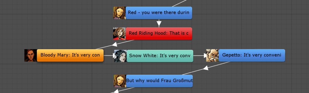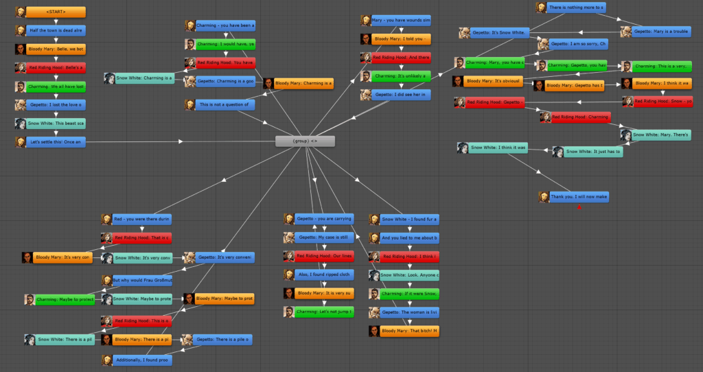 Als der erste Produktionstag kam, hatte ich alles durchgeplant. Ich wusste, auf welche Erfahrung ich hinauswollte, das Drehbuch war fertig und eine Liste mit allen Materialien lag vor, wir mussten das Ding nur noch fertigstellen. Im Nachhinein frage ich mich, warum ich nicht erkannt habe, dass der Umfang des Spiels viel zu groß war. Das Spiel sollte 7 Bildschirme, 9 Charaktere, 610 Dialogzeilen und eine Verzweigungslogik haben. Im Nachhinein betrachtet, ein lächerliches Ziel für einen 2-Wochen-Jam.