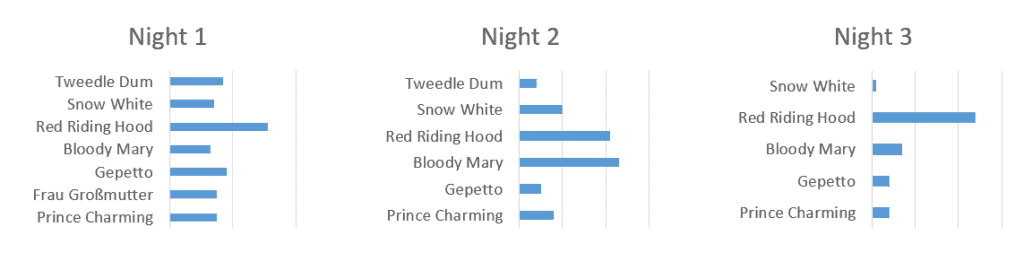 Da die Idee war, das Schreiben eines "Whodunit"-Krimis zu testen, ist es ziemlich wichtig, dass die Spieler/innen nicht schon früh den richtigen Mörder wählen. Auf diese Weise wäre die Spielzeit stark eingeschränkt und die Spieler würden keine Verzweigungen zu sehen bekommen, die normalerweise ein Aha-Erlebnis für die Spieler sind. Wir haben Statistiken darüber gesammelt, wen die Spieler/innen ausgewählt haben, und es hat sich gezeigt, dass viele Spieler/innen in der ersten Nacht tatsächlich den richtigen Mörder gewählt haben.